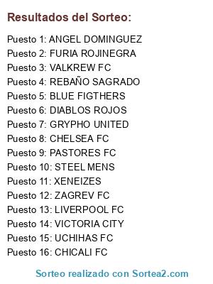 Lista de participantes: XENEIZES, CHICALI FC, BLUE FIGTHERS, ZAGREV FC, FURIA ROJINEGRA, LIVERPOOL FC, VALKREW FC, PASTORES FC, REBAÑO SAGRADO, UCHIHAS FC, ANGEL DOMINGUEZ, STEEL MENS, GRYPHO UNITED, DIABLOS ROJOS, VICTORIA CITY, CHELSEA FC.