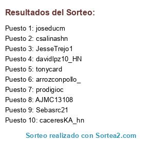 Lista de participantes: davidlpz10_HN, AJMC13108, joseducm, prodigioc, Sebasrc21, caceresKA_hn, arrozconpollo_, JesseTrejo1, csalinashn, tonycard.
