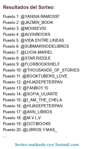 Lista de participantes: @_BELENESPECHE, @_BOOKADDICTED (3), @_CORAZONDEPAPEL, @_LLUVIADELIBROS_, @13_ALEBARAHONA, @AFTERLIFEBOOK, @AILENBOOKSHELVES, @ALVINBOOKS (3), @AGUSTINA_ULIARTE, @AILURXS_FULGENS, @AMORPORLOSLIBROS97 (3), @ANDREJONATIC, @ANN_LIBROS, @ANA_LUNATICA, @ARCOIRIS_DE_PALABRAS, @ARIA_BACCI, @ATRAPADOSENTRELIBROS_, @BEL.RIDDLE, @BITACORADESOFI, @BLOWINTHEBOOK (3), @BOOKISHPELL, @BOOKSZONEX, @BOOKTUBERS_LOVE (3), @CAMGRAMAJO (3), @CAMI_BELEN_99, @CASTILLODEPAPEL, @CAZADORADEHALLIDAY (3), @D.TRAVELBOOKS, @DREAMMEWORDS, @ELFOS_LECTORES, @ELMARCAPAGINAS (3), @ELOJITOPILOTO, @EMIRIBANEZ, @ENTRELETRASYPAPEL, @ENTRESUSPAGINAS, @ERIKABOOKS (4), @FANBOY_ARG, @FANBOY.15 (3), @FARROBOOKS, @ FERNANDAM1907, @FIOREMASIELLO, @FLORBOOKSHELF (3), @FRANCINASBOOKS (3), @H_D_LIBROS (3), @HABEMUSLIBROS, @HEAVENBOOKS, @HIJADEPETERPAN (3), @I_AM_THE_CHELA (4), @INLIBROS, @IVAN18CERDERA, @JAZMIN_BOOK (3), @JESSIETABOADA (4), @KITTYCAKE69 (3), @LAMALELUNA (3), @LAUSBOOKS, @LECTORANTARTICO, @LEPASSEURDAURORE (3), @LETRASPARAISOLITERARIO, @LEYENDOCONAMOR, @LIBROSCONTE (3), @LIBROSENTRESTRELLAS, @LIBROS_MI_GRAN_AMOR, @LIBROS.Y.MAS_, @LITERATURACOLORSATURNO, @LOCURAXLOSLIBROS, @LOSLIBROSSONMIMUNDO_, @LOSTIN.BOOKS, @LOVERFORBOOKS, @LUCIA.MARIEL (4), @M.V.L.V, @MA.JO_V, @MADELEINGILMOUR, @MADE_STYLES (3), @MAFIAOFBOOKS, @MAGICAMENTE_LIBROS, @MALDITOSMUGGLES, @MASQUEPALABRASBLOG, @MIMUNDOLIBROS (3), @MONSEVID, @MUNDO_LLENO_DE_IGUALDAD (3), @NAMILOVESCHANNIE, @NAT.GRACIA97, @NAYESQUILDO, @NELLY_ROJAS_LARA, @NLITERARIA (3), @OCTIBOOKS (3), @ONLY_ONE_MORE_CHAPTER, @PAULIS_BOOKS (3), @PRINCIPE.LECTOR, @READERDOGS, @READINGRUNE, @RECOLECTORA_DE_PALABRAS, @SARAH_TOLOZA (3), @SOFIA_ULIARTE, @STAR.RIDDLE (3), @SUBMARINODELIBROS (3), @SUMERGIDAENTINTA (3), @SUMMERNIGHTBOOKS, @THELADYOFBOOKS, @THELEGENDARYBOOK, @THEPOETRYOFBOOKS (3), @THOUSANDS_OF_STORIES (4), @TOBBIGARCIA (3), @UNACHICAFANGIRL, @VELLICHORLIBROS, @VERITOOBOOK, @VEROOSHOCK, @VIDA.ENTRE.LINEAS (3), @XBOOKSANDCOFFEEX (3), @XXBRISULISXX (3), @YANINA.RAMOS97, @YOUNGLYRICALLIT.