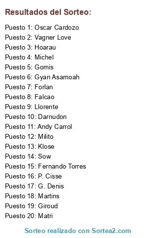 Lista de participantes: Llorente, Falcao, Klose, Martins, Gomis, Giroud, Darnudon, G. Denis, Hoarau, Oscar Cardozo, Fernando Torres, Andy Carrol, Sow, Milito, Gyan Asamoah, Matri, Vagner Love, Michel, P. Cisse, Forlan.