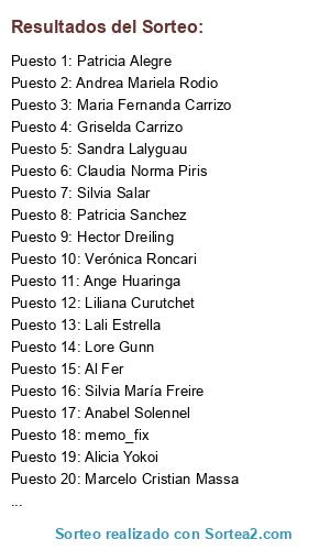 Lista de participantes: Ada Rossetti (3), Adabella Robotnik (3), Adriana Galvan, Agustina Gesualdo (3), Aldana Barba (3), Alejandra Varela, Al Fer (3), Alicia Yokoi, Ana Maria Vizzoni (3), Ana Claudia (3), Ana Salinas (3), Anabel Solennel (3), Anabella Valeria Duttweiler (3), Anahi Barboza Vicencio (3), Analia Diaz (3), Analia Morgade (3), Analía Tejedor, Andrea Madero, Andrea Mariela Rodio (3), Ange Huaringa, Anton Diaz, Ariana B Correa (3), Azul Wojtiuk, Barbara De León (3), Barby Castrataro, Bebo Ford Appendino, Belu, Belu Vitale, Belunchita Heredia, Cace Cotalayala (3), Camila Cervellera, Camila Chancherosi (3), Camy Maze (3), Carla Latrecchiana, Caro Caccavallo, Caro Delg (3), Carolina Nogués de Gomez, Cecilia Mounes (3), Celeste Andrea Piris (3), Cintia Gesualdo, Claudia Norma Piris (3), Coco Linale, Constanza Goria (3), Cris Solo Cris (3), Cristina Carusi, Cristina Parente (3), Cynthia Rodriguez Krebs (3), Dami Benedetti, Daniela Delorenzi, Daniela Mateluna Ramirez (3), Deby Ayunta (3), Dianita Beatriz, Dori Eschbach (3), Edith Lamas (3), Ely Gonzalez, Enrique Erdmann, Estela Beatriz Maguna (3), Estela Torres, Euge Urbi, Evangelina Sccasso (3), Fernanda Sanchez (3), Flor Gómez (3), Florencia Agazzi, Florencia Blanco (3), Flory Marinelli, Gabi Marcos, Gabriela Cabrera, Gabriela Laura, Gise Gimenez, Gisela Castro (3), Gisela de Oliveira (3), Gisela Ruiz (3), Gisela Yannino, Giuliana Soledad, Gladys Guzman, Gra Ricciuti, Graciela Filomeno (3), Graciela Luisina Parodi (3), Graciela Valdéz (3), Gricelda Acevedo (3), Griselda Cabaña, Griselda Carrizo (3), Guillermina Pettinari (3), Gus Ferrazzo (3), Hector Dreiling (3), Helen Carolay D. La O Lopez (3), Irene Cremona (3), Jack, Jazmín Rosenfeld (3), Jesica Soledad (3), Jorge Ruben Rios (3), Judit Yudite, Judith Ant (3), Karina Alonso, Karyn Costilla (3), Keila Arancibia (3), Klau Zuñi (3), Lali Estrella (3), Laura Fernandes, Laura Granao Masajes Y Maquillaje (3), Laura Solange Falkowicz (3), Leandra Villar, Liliana Curutchet (3), Liliana Villar (3), Lore Gunn, Lorena A Gallardo, Lorena Sanchez (3), Lucas Del (3), Ma Belén, Ma Rie, Marce Lulu (3), Marcela Diblas, Marcelo Cristian Massa (3), María Belén, Maria Belen Robledo, María Cacc (3), Maria Ester, Maria Fernanda Carrizo (3), María Guadalupe Rial (3), Maria Jimena (3), Maria Julia Cairoli (3), Maria Laura Scardigno, Maria Rosa Noval (3), María Rosa Pulerá (3), Maria Sol Genovesi (3), Mariana Ayas, Mariana Shain (3), Mariela Alarcon (3), Marisa Boccalatte (3), Marisa Sciombra (3), Marite Rosalez Camuz, Marithe Cami, Marta Avila (3), Melisa Muñoz (3), Meluu Goñi (3), memo_fix, Mica Alan (3), Miguel A. Garcia (3), Milena Dancervich (3), Miriam Jimenez, Mirtha Olga Culasso, Monica Patricia Marin (3), Morena Var, Muma Marcos, Nat PecTrez (3), Natalia Barbieri, Natalia Dure, Natalia Gonzalez, Natalia Naveira (3), Nati AC (3), Nicole Kurowski (3), Nogüi Noriega, Nora Lentini Griffa (3), Norma Lovato (3), oriyanelli, Pamela Mamani, Paola Sanchez, Patita Rodriguez, Patricia Adell (3), Patricia Alegre (3), Patricia Carrozzino, Patricia Cervellera, Patricia Sanchez (3), Pety Esteban (3), Romina Vanesa Millan (3), Rominalucy Alvarez (3), Rosana Rossi (3), Roxana Calderon (3), Roxana Saire, Sandra Lalyguau (3), Sandrita Ramos Veron, Silvana Otero (3), Silvia Liliana (3), Silvia María Freire (3), Silvia Navarra, Silvia Rivero, Silvia Salar, Silvina Eli Cespedes (3), Silvina Feria, Silvina Garcia, Silvina Mascaró, Sofia Sampietro (3), Sol Ayelén Suárez, Sol Gamarra (3), Sole MV, Soledad Arena (3), Soledad Cufre (3), Stefita Drebnieks (3), Stella Maris Pardini, Susana Elizalde (3), Tatii Figueroa, Tefi Gallastegui, Teresa Ángela, Valentina Venicio, Valeria Carolina Grosso (3), Valeria Laura (3), Vanesa Melgar, Vanesa Romano, Veritoh Morano (3), Vero Seminara De Gomez, Veronica A. Barba de Carpintero (3), Veronica Reinoso, Verónica Roncari (3), Veronica Souto, Victoria Pedro, Yami Polimeno (3), yanihdelopez, Yaqui Lopez (3), Yolanda Honoria Paz.