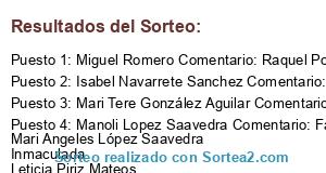 - Ganador 4: Manoli Lopez Saavedra Comentario: Fantástico... Mari Angeles López Saavedra Inmaculada Leticia Piriz Mateos