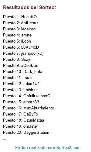 Lista de participantes: мя ¢яα¢кє∂, тѕυи, omaster, el_pro, Lbibbins, Kurumi Disk, Fire!, DaggerStation, LvisMessi, GzusMataa, OofullrakionoO, ¤Gaara¤, Dark_Fatal, Sozym, Bob Marley, #Cookiee, edua147, elpran33, jose miguel, MaxAburrimiento, lLooh, Josdavi, .Scorpion, jeanpool[xD], L0Kvr4xD, arone, Josepht12, iGreek!, [xX Sir xX], HuguiitO, GaByTo, leoelpro, >fernhan2<, AniiJesus.