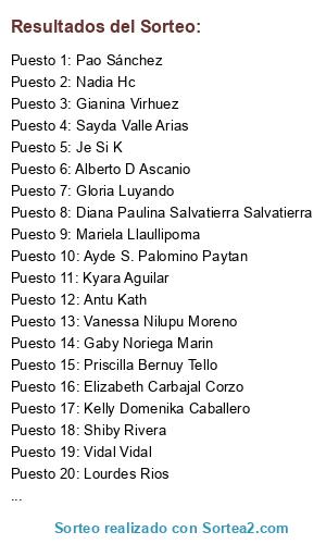 Lista de participantes: Vidal Vidal, Cinthya Fards, Lesly Estefani Cordova Dominguez, GraCe Suarez Sànchez, Cinthya Gonzales, Jessica Milagros Macuri, Catherine Chilenita, Karla Q. Mendez, Lilianitha Lescano Zuloaga, Milady Love, Kimberly Vera Mesias, Yesabell Ivette Casiano Luperdi, Edita Castro, Sheila Oré, Mariela Campos Padilla, Gaby Noriega Marin, Nanys Vilca, Carmen Garcia Sanchez, Eliza Delgado Mondragon, Pao Sánchez, Gianina Virhuez, Brisseth Perez Florindez, Rocio Florindez Negri, Ines Galindo, Raquel Rua Yllaconza, Claudia Vinces, Monica Paola Durey, Crys Alvarado Saldaña, Jessica Cáceres Dávila, Kelly Domenika Caballero, Lorena Garcia Mujica, Carlita Canales, Danita Pili, Eliana Isabel Quintana Diaz, Teo Gutierrez Gonzales, Briyit Villafuerte, Judith Cayetano Rivera, Antu Kath, Lourdes Rios, Kary Guadalupe Mesía Tirado, Jen Oneill, Isabel Canales, Karitho Pinedo Rojas, Fiore Rocio B. P, Ericka Meza, Andrea Rosas, Lady Vargas Galindo, Kyara Aguilar, Yisela Lopez, Sayda Valle Arias, Ivonne Carlos, Milagros Maribel Sernaqué Macharé, Karla Olivo Miranda, Josefina Ysa Antiporta Conopuma, Marianella Toribio, Ysa Urquizo, Fiorela Loo Aldave, Mariela Llaullipoma, Val Campos Martinez, Jeniffer Echavarria Montero, Luchito Quiburg, Pamela Martinez, Ruth Fernandes, Yoselin Andrea Huapaya Capcha, Vanessa Nilupu Moreno, Maria Paola Amaya Sayago, Jackeline Vanessa LC, Carolina Soplin, Nadia Hc, Nathaly Lua, Shiby Rivera, Roxana Pamela Aquino Aquino, Yuliana Delgado Bazan, Priscilla Bernuy Tello, Elva Adelaida Tirado Monteverde, Xto Grazie, Giovanna Sandoval de Pacitti, Lesly De la Torre, André Vargas Infansón, Jessica León, Leny Silva Diaz, Elizabeth Carbajal Corzo, Marilia Tejeda Figueroa, Liset Ochoa, Miriam Cantorin Paredes, Alberto D Ascanio, JuLia Daza, Rossangela D Reyna, Alicia Herencia Ortega, Amancio P Palma, Luis C Garamendi, Angie Coronel Palacios, Flor Juliana Elias, Gloria Luyando, Maritza Olivares, Les Mimi, Rocío Nadiezka Párraga Sáez, Angela Y. Hernandez Medrano, Ayde S. Palomino Paytan, Hector Uralcan, Ruben Feliciano, Wil Alcantara, Gaby Gutierrez Arias, Katherine Marie SA, Barbara Alejandra Gonzales Pacheco, Rosa Perez, Wilder Eduardo, Cinthya De Salas, Je Si K, Diana Paulina Salvatierra Salvatierra, Gladys Castillejo, Martin Urpe, Lis Mar Campos.