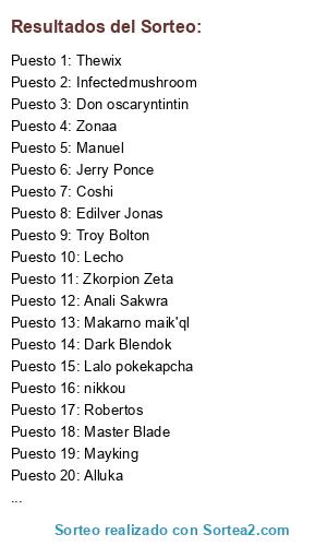 Lista de participantes: Dark Blendok,, Zkorpion Zeta,, Makarno, maik'ql,, Lalo pokekapcha,, Gigi Buffon,, Mayking,, Infectedmushroom,, Master Blade,, Coshi,, Zonaa,, Jerry Ponce,, Troy Bolton,, Edilver Jonas,, Manuel,, Alluka,, Don oscaryntintin,, Robertos,, Lecho,, Thewix,, madara susano,, anali., Zizustyle.