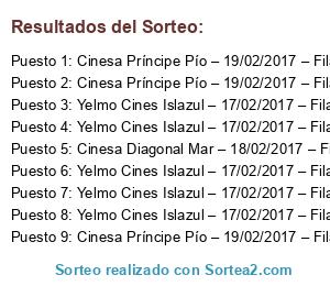 Lista de participantes: Cinesa Diagonal Mar – 18/02/2017 – Fila 9 – Asiento 13, Cinesa PrÃncipe PÃo – 19/02/2017 – Fila 14 – Asiento 31, Cinesa PrÃncipe PÃo – 19/02/2017 – Fila 14 – Asiento 35, Cinesa PrÃncipe PÃo – 19/02/2017 – Fila 14 – Asiento 38, Yelmo Cines Islazul – 17/02/2017 – Fila 7 – Asiento 5, Yelmo Cines Islazul – 17/02/2017 – Fila 7 – Asiento 7, Yelmo Cines Islazul – 17/02/2017 – Fila 7 – Asiento 9, Yelmo Cines Islazul – 17/02/2017 – Fila 7 – Asiento 11, Yelmo Cines Islazul – 17/02/2017 – Fila 7 – Asiento 13.