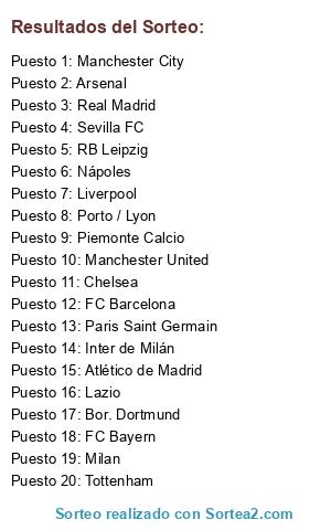 Lista de participantes: FC Barcelona, Real Madrid, Atlético de Madrid, Sevilla FC, FC Bayern, Bor. Dortmund, RB Leipzig, Manchester City, Liverpool, Chelsea, Manchester United, Tottenham, Arsenal, Piemonte Calcio, Nápoles, Inter de Milán, Milan, Lazio, Paris Saint Germain, Porto / Lyon.