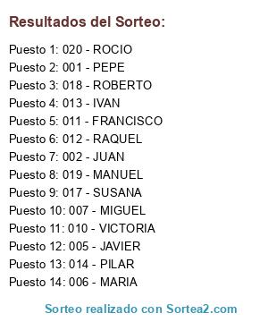 Lista de participantes: 001 - PEPE, 002 - JUAN, 003 - ANTONIO, 004 - RAFAEL, 005 - JAVIER, 006 - MARIA, 007 - MIGUEL, 008 - CARMEN, 009 - MARTA, 010 - VICTORIA, 011 - FRANCISCO, 012 - RAQUEL, 013 - IVAN, 014 - PILAR, 015 - LOLA, 016 - EMILIO, 017 - SUSANA, 018 - ROBERTO, 019 - MANUEL, 020 - ROCIO.