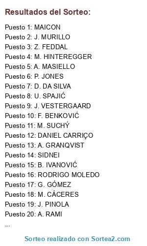 Lista de participantes: J. VESTERGAARD, Y. GÓMEZ, M. SUCHÝ, M. CÁCERES, U. SPAJIĆ, PABLO, NALDO, RODRIGO MOLEDO, B. KAMARA, PEDRO MENDES, M. KEANE, SIDNEI, A. MASIELLO, P. JONES, B. IVANOVIĆ, MAICON, J. MURILLO, L. LÓPEZ, Z. FEDDAL, T.KOLODZIEJCZAK, A. GRANQVIST, M. SARR, C. SMALLING, G. GÓMEZ, J. PINOLA, DANIEL CARRIÇO, S. AZIZ, M. HINTEREGGER, F. BENKOVIĆ, A. SOUMAORO, A. EPUREANU, A. RAMI, D. DA SILVA, J. EVANS, N. PALLOIS, IVAN MARCANO, FERRO.