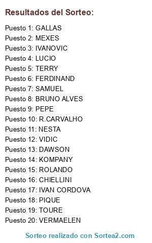 Lista de participantes: VIDIC, CHIELLINI, LUCIO, PIQUE, TOURE, TERRY, PEPE, SAMUEL, KOMPANY, GALLAS, DAWSON, FERDINAND, BRUNO ALVES, IVAN CORDOVA, VERMAELEN, NESTA, ROLANDO, R.CARVALHO, IVANOVIC, MEXES.