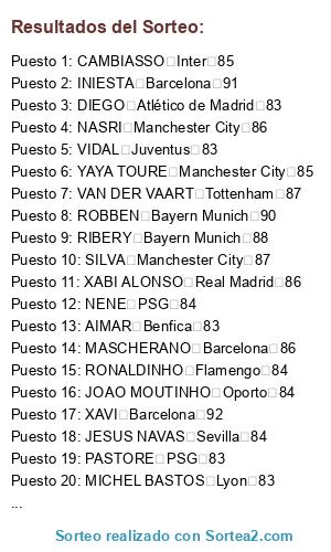Lista de participantes: ROBBEN Bayern Munich 90, SNEIJDER Inter 88, MODRIC Tottenham 88, RIBERY Bayern Munich 88, GERRARD Liverpool 87, SILVA Manchester City 87, SCHWEINSTEIGER Bayern Munich 87, VAN DER VAART Tottenham 87, LAMPARD Chelsea 87, INIESTA Barcelona 91, XAVI Barcelona 92, MASCHERANO Barcelona 86, XABI ALONSO Real Madrid 86, OZIL Real Madrid 86, NASRI Manchester City 86, YAYA TOURE Manchester City 85, CAMBIASSO Inter 85, KAKA' Real Madrid 85, FARFÁN Schalke04 84, JOAO MOUTINHO Oporto 84, DANNY Zenit 84, CAZORLA Málaga 84, ESSIEN Chelsea 84, HAMSIK Napoles 84, HERNANES Lazio 84, JESUS NAVAS Sevilla 84, NENE PSG 84, RONALDINHO Flamengo 84, PASTORE PSG 83, AIMAR Benfica 83, GIGGS Manchester United 83, DE ROSSI Roma 83, DIEGO Atlético de Madrid 83, MICHEL BASTOS Lyon 83, VIDAL Juventus 83, PIRLO Juventus 83, MONTILLO Cruzeiro 82, DOWNING Liverpool 82, LUCHO GONZALEZ O.Marseille 82, FÁBREGAS Barcelona 88.