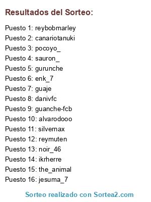 Lista de participantes: silvernax, ikrherre, reybobmarley, guanche-fcb, pocoyo_, sauron_, danivfc, gurunche, canariotanuki, alvarodooo, jesuma_7, noir_46, guaje, enk_7, reymuten, the_animal.