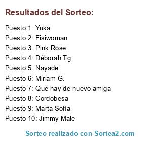 Lista de participantes: Paxindia, Gondor Tari, Celiha, Chica, Morgan, May, Andrea (Grasshopper), Que hay de nuevo amiga, Hrista, Belen Belen, Deborah, Wiky, M*, Ana Cryss, Xandratelier, Olga S., Bubbles, Emma (pito-parker), Bettie, Danui, Laura (8 dic), Popon, Gug, Chii, Mar(8dic), Tessa, Sacerdotisa, Des choses de femmes, Luz, Valeria, Laadyreebel, Zen Energy, Tormentilla28, Lorena (8 dic), Nayade, Carenas2009, Siempremona, Miss Thirty, Meryy, Pink Rose, Lulee, Obandina, Kelika, Fisiwoman, Manuvigo, Elenita, Veronika Torralbo, María Jesús, Marta (8dic), Hueleacoco, Nía, Estefanía Lovelifefashion, Julian, Smile Felt Broches, Hiss1987, María Glez, Be fashion Be glamour, Patrizana, Calipso, Rosa (8dic), Nau, Anuska, Nestheroski, Asun M, Zaida, ccrrss, Tere Linares, María Rosa (8dic), Damber, Maribel F, Branca de Neve, Mrosagra, Amigas Make Up, Elisa(maquillandolibros), Shamarkanda, Alencal, Sandra Sardina, Andrea (la vida en rosa), Arangaitzka, milaco, Angelosas, Amparo, Mireiacqua, Frjzara, Victoria (9dic), Naishi, Itsa, Lara, Pitujones, Aur, LaurikWorld, marielagos2000, Tini2000, Mirianrocu, Olivia, Esther (9dic), Claudia Alonso, Montse Inés, Ana Belén (Ruben224), Lola AyA, Modesta, Jimmy Male, Chimi Chu, Lilis, Marta Diaz, Mery (Ketxia torres), Shikilandia, Lunaberria, Lola.mine, In My Closet, Lourdes, Factoria de colores, Silviuca, Ayna, Anna M.G, Gisela, Patrizia (9dic), Ana Isabel León, Nuria Vañó, Bao Chu, Ana Ferri, Sonia (9dic), Suky, Perlica84, Diana Aguado, María Barrio, Rocío (10dic), Misifubroches, Julias.v., Sirocox, Kashira, Miguel, Aurora Díez, Orugui, Emma Bv, Anastasia Langa, Faty44, Belinda, Karmencitha, Conchi (Nube de Pegatiina), Barbra Glo, Luna Lumi, Mar.16s, Roc, Maria*, Camelia Andrasescu, Yuka, RaquelyJose, Sole, Moda Elle, Luassha, Ani C, Eva Trujillo, Bubble, Siloh, Missindependent, Déborah Tg, Melomana, Raquel Pelegrín, Miss Soler, Teté Valero, El hada de las palabras, Piedi, Fashioonmommy, manosmarili, Maria Jose (12 dic), Paki, La reina cotilla, Crischina, Ana (13 dic), Naida Rosetta, Anafromspain, Villa Rosa, MakeupbyMaryland, Cordobesa, Raquel del Olmo, Mistress, Campanilla.martin, Roos, Axia, Itzi, Alejandra (13 dic), Lurm, Laura (13dic), My Constant, Verikika, Yurena, Laura Burbujas Rosas, Marta Sofía, Olga Zach, Smargumiel, Scarlet Style, Rosa5523, Moulin, Mai V, La NIña Mariposa, Wendy1975, Odaklesam, Jose Manuel Gutierrez, Naira, Inma, Monique, Isa-09, Bambaki83, Elisabet, Isabel (15dic), Ana Romero, Rmartinez53, Paulalv, Moli, Carole, Morochita, Lara Ibañez, Vintage Lady, Jesusloz, Nuria, Elena (17dic), Pittussia, Nayru, Claudia Lorena, Laura Rojas, Gloria1986, cvazcvaz, Ghallegha, *Irene*, María (tan solo poemas), Ilezzikaa, Kellyta, Chispa, HaDA, Josefa (22 dic), Fashionfamous, maipevivi, danynski2345, Belma101, Ada, Rosa Maria (27dic), Pepi B., tepatry, rcasarr, Marta A.P., Rosibenavides, Isa(28dic), Ixxa, Stomier, MsAlezhita, Lidia, Ondeia, Nami, Abrochese, Imanita, Santossmt, Maruxi, Toupaipai, Sara (30dic), Idaira, Ivaina Diamond, CosmetiCrazy, Little Buterfly, Uxi, Ixilda, Kasumi, Jennifer, Silvia (2 enero), Yamilet, Ballons, Miriam G..