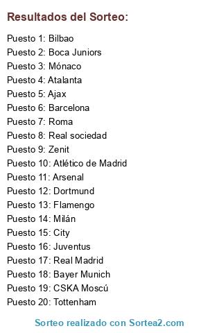 Lista de participantes: Milán, Roma, Arsenal, City, Atlético de Madrid, Real sociedad, Mónaco, Barcelona, Dortmund, Boca Juniors, Zenit, Flamengo, Real Madrid, CSKA Moscú, Bayer Munich, Bilbao, Ajax, Atalanta, Tottenham, Juventus.