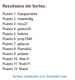 Lista de participantes: Alex.H, fedinho, jordy1946, chesterMg, RamafulL, Mazzi, gaston25, Rodri71, mou27, Dyegoandres, gabycai, polasto.