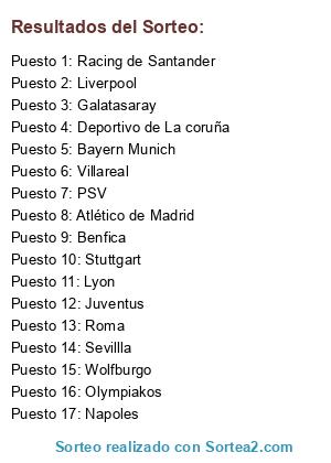 Lista de participantes: Liverpool, Galatasaray, Bayern Munich, PSV, Villareal, Racing de Santander, Stuttgart, Napoles, Roma, Wolfburgo, Juventus, Benfica, Lyon, Atlético de Madrid, Sevillla, Olympiakos, Deportivo de La coruña.