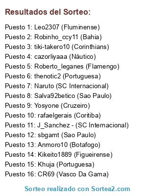 Lista de participantes: cazorliyaaa (Náutico), Leo2307 (Fluminense), Anmoro10 (Botafogo), Kikeito1889 (Figueirense), sbgamt (Sao Paulo), Salva92betico (Sao Paulo), J_Sanchez - (SC Internacional), tiki-takero10 (Corinthians), Naruto (SC Internacional), Robinho_ccy11 (Bahia), CR69 (Vasco Da Gama), Yosyone (Cruzeiro), Roberto_leganes (Flamengo), thenotic2 (Portuguesa), Khuja (Portuguesa), rafaelgerais (Coritiba).