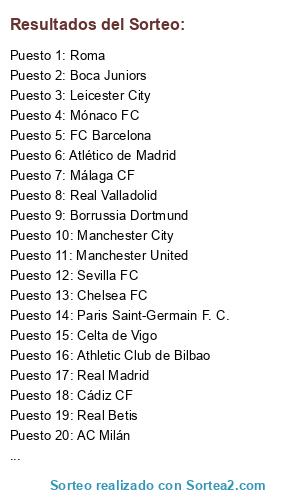 Lista de participantes: AC Milán, Albacete Balompié, Athletic Club de Bilbao, Atlético de Madrid, Bayern Múnich, Boca Juniors, Borrussia Dortmund, Cádiz CF, Celta de Vigo, Chelsea FC, FC Barcelona, Leicester City, Liverpool FC, Málaga CF, Manchester City, Manchester United, Mónaco FC, Paris Saint-Germain F. C., Real Betis, Real Madrid, Real Valladolid, Roma, Sevilla FC, Watford FC.