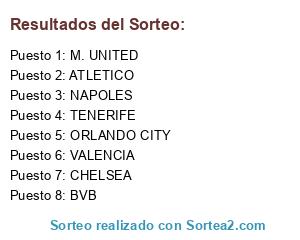 Lista de participantes: ATLETICO, VALENCIA, NAPOLES, BVB, CHELSEA, M. UNITED, TENERIFE, ORLANDO CITY.