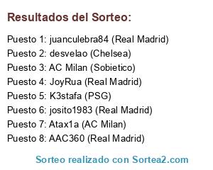 Lista de participantes: Atax1a (AC Milan), AC Milan (Sobietico), K3stafa (PSG), JoyRua (Real Madrid), josito1983 (Real Madrid), juanculebra84 (Real Madrid), desvelao (Chelsea), AAC360 (Real Madrid).