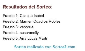 Lista de participantes: brallido , vanoverdonderis , miriamferfer , manjon77 , mjosegomezfeliu , lorenaferrer76 , palmaal_2 , estherbtr , sergio_garbi_esteban , isa_pinyita , susanmcfly , inmillainma , didi_loz , mihijoprimero , verodue , martapazosm , evaaguilera3 , tttannnia , Aroa Lo Ig , Estela Carceller Milian , Carmen Díez , Mamen Cuadros Robles , Mayka Matet , MT Domínguez Escrig , Paloma Gaspar Gil , Mercedes Molero , Lulu Lopez , Rosa Gutierrez Rubio , Casalta Isabel , Eva Szucs , Montse Sevilla , Teresa Flores Torrent , Veronica Belles , Alicia Aguilella , Mercedes Moreno , Arantza Ibfer , Anna Molla , Oscar Aranega Ferreres , Montse Caro Bazaga , Susana SF , Eva Sevilla Claverol , PauLa Mar , Elena Gil Ferrando , MJ Caballero , Montse Herreros , Marco Tarra , Jose Ramón , Jessy NFranch , Maria Soler , Gloria Morcillo Marín , Nerea Fàbrega Lorenz , Esther Boix , Jessica Garrido , Ana Lucas Marti , Estela Navarro Milla , Marisol Gavara Ocaña , MJosé Gomez Feliu , Carina Hernandez , Mari Camañes Vilarrocha , Agut Noemi , Maria Blanco Pérez , Marta Mar , Maria Beltran Posilio , Elisabeth Lopez , Paula Garcia Flores , Javier Canet Pesudo , Rocio Guerrero Benzo , Fernando Crespo Belles , Alexis Martinez Sabuco , M Carmen Sanchez Serrano , Mari , Alexis martinez sabuco , Noelia , MJosé Gómez Feliug.