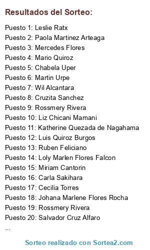 Lista de participantes: Mercedes Flores, Shirley Ruby Garcia Tutaya, Kalieska Grau Garcia, Marianella Toribio, Milton Gustavo Sanchez Arcos, Martin Urpe, Cecilia Torres, Elder Gisela Norabuena Rojas, Ivonne Carlos, Wil Alcantara, Chabela Uper, Daisy Urquizo Perez, Hector Urquizo Alcantara, Jaszmine Ashira Medina, Stephanie Nicole, Liz Chicani Mamani, Luis Quiroz Burgos, Rossmery Rivera , Rossmery Rivera , Paola Martinez Arteaga, Carmen Garcia Sanchez, Marilyn Toledo, Rebeca Neyra, Ruben Feliciano, Loly Marlen Flores Falcon, Amparo Grau Medina , Amparo Grau Medina , Stephanie Prado Caballero, Angela Y. Hernandez Medrano, Nohemi Guzman Mendoza, Mirtha Muñoz, Jessica Cuya, Lorena Celis, Elizabeth Valle, E Johana Rojas Rendón, Cruzita Sanchez, Haylin Roncal, Carla Sakihara, Katherine Quezada de Nagahama, Leslie Madime, Perla de Díaz, Monica Durand, Fiorella Desiree Pinedo Elaluf, Lorenzo Celis, Salvador Cruz Alfaro, Johana Marlene Flores Rocha, Miriam Cantorin, Ana Corzo, Ysa Urquizo, Leslie Ratx, Carolina Reyes, Karolay Mandujano Abad, Mariela Llaullipoma, Mario Quiroz, Rosa Perez, Karina Barahona, Lorena Begazo Delgado, Marcia Germany, Lourdes Perez.