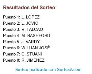 Lista de participantes: C. STUANI, WILLIAN JOSÉ, L. JOVIĆ, R. JIMÉNEZ, R. FALCAO, L. LÓPEZ, J. VARDY, M. RASHFORD.