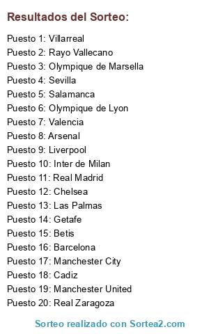 Lista de participantes: Salamanca, Betis, Arsenal, Cadiz, Real Zaragoza, Inter de Milan, Sevilla, Olympique de Lyon, Valencia, Getafe, Manchester City, Las Palmas, Liverpool, Barcelona, Chelsea, Manchester United, Olympique de Marsella, Villarreal, Rayo Vallecano, Real Madrid.