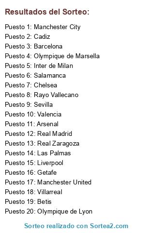 Lista de participantes: Salamanca, Betis, Arsenal, Cadiz, Real Zaragoza, Inter de Milan, Sevilla, Olympique de Lyon, Valencia, Getafe, Manchester City, Las Palmas, Liverpool, Barcelona, Chelsea, Manchester United, Olympique de Marsella, Villarreal, Rayo Vallecano, Real Madrid.