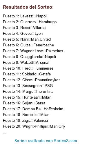 Lista de participantes: Adriano Flamengo, Agbonlahor Aston Villa, Agüero Atletico, Amauri Juventus, Ashton West Ham, Babel Liverpool, Ballotelli Inter, Baros Galatasaray, Barrios B.Dormund, Bastos Lyon, Bojan Barsa, Borrieillo Milan, Cabañas America, Cacau Stuttgart, Capel Sevilla, Cardozo Benfica, Carew Aston Villa, Chamakh Girondins, Cisse Phanatinaykos, Crespo Genoa, Defoe Tottenham, Demba Ba Hoffenheim, Donovan L.A Galaxy, Dzeko Wolfburgo, Eduardo Arsenal, Falcao Oporto, Farfan Shalcke, Fred Fluminense, Gignac Toulouse, Govou Lyon, Grafite Wolfburgo, Guerrero Hamburgo, Guiza Fenerbache, Helmes B.Leverkusen, Higuain Real Madrid, Hugo Almeida Werder Bremen, Hulk Oporto, Huntelaar Milan, Iaquinta Juventus, Jo Everton, Joaquin Valencia, Keane Tottenham, Keita Galatasaray, Klose Bayern Munich, Kuranyi Schalke 04, Kuyt Liverpool, Lavezzi Napoli, Liedson Sporting Lisboa, Lisandro Lopez Lyon, Llorente Ath.Bilbao, Luca Toni Bayern Munich, Luis Fabiano Sevilla, Luis Garcia Espanyol, Mario Gomez Bayern Munich, Martins Wolfburgo, Mata Valencia, Menez Roma, Munitis Racing, Murgu Fiorentina, Nani Man.United, Negredo Sevilla, Niang Marseille, Nihat Besiktas, Nilmar Villareal, Obasi Hoffenheim, Olic Bayern Munich, Owen Man.United, P.Crouch Tottenham, Pazzini Sampdoria, Petric Hamburgo, Pizarro Bremen, Podolski FC Koln, Pogrebkyak Stuttgart, Quaggliarela Napoli, Raul Real Madrid, Reyes At.Madrid, Robinho City, Rocchi Lazio, Rodriguez Oporto, Ronaldo Sao Paulo, Rossi Villareal, S. Pongolle At. Madrid, Santa Cruz City, Saviola Benfica, Sessegnon PSG, Soldado Getafe, Suarez Ajax, Taddei Roma, Tamudo Espanyol, Trezeguet Juventus, Valencia Man.United, Van Nistelrooy Real Madrid, Vicente Valencia, Voronin Liverpool, Vucinic Roma, Wagner Love Palmeiras, Walcott Arsenal, Wright-Phillips Man.City, Young Aston Villa, Zarate Lazio, Zidan B.Dormund, Zigic Valencia, .