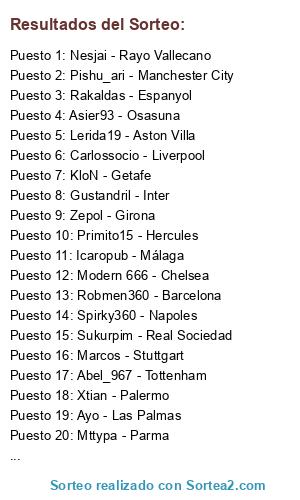 Lista de participantes: Hernan20: Rayo Vallecano, Panterjack: Villareal, il javi 17: Manchester City, Adrilozano: Atlas de Mexico, Mr Juanitus: RCD Mallorca, Jorchebopa: Levante UD, Sr Pistolas 86: Juventus, xXxValientexXx: Real Betis, Aguuu l7l: Sevilla FC, BaIIes: Ajax, l Mas7eeRz l : Galatasaray, CarlosBD9: Celtic de Glasgow, HaLiTo xGCFx: AS Roma, Xx eL SaMu xX: FC Barcelona, Jimmy Baek: Borussia Dortmund, Juanfran333: Malaga CF, IL PRINCIPE I22: Inter de Milan, zZzZ JONA zZzZ: Totteham, Ivan l 96 lx: Atlético de Madrid, AbeeceedariO v2: Hannover 96, x el pardela x: CD Tenerife, Jose Granada97: Bayer Munich, PuTTO ViiLa I: UD Las Palmas, Kuality100: Shrewsbury Town, Xx JoSe 7 xX: Manchester United, Xx KeNstaLL xX: Celta de Vigo, Andrew Torre: Real Sociedad, El Renegado95: Hamburgo, Carpier: Real Salt Lake, BUTR4666: Real Oviedo, Capo Canoneri: UD Almería, BestElTopillo: New York City.