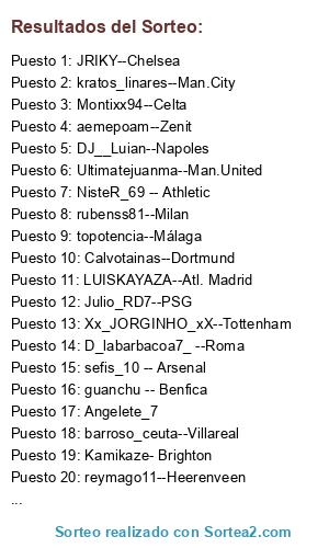 Lista de participantes: Julio_RD7--PSG, Calvotainas--Dortmund, LUISKAYAZA--Atl. Madrid, empresariales3--Real Madrid, Ultimatejuanma--Man.United, topotencia--Málaga, Fabiete-murcia--Barcelona, aemepoam--Zenit, JRIKY--Chelsea, rubenss81--Milan, malagueo -- Liverpool, guanchu -- Benfica, NisteR_69 -- Athletic, sefis_10 -- Arsenal, kratos_linares--Man.City, barroso_ceuta--Villareal, Montixx94--Celta, Miguel_Fdez_97--Inter, DJ__Luian--Napoles, reymago11--Heerenveen, JuanmaZero--Shaktar Donest, D_labarbacoa7_ --Roma, Jimenystelrooy85 -SEVILLA, honda_ipr_civic boca juniors, Ceutito - Oporto, Kamikaze- Brighton, Xx_JORGINHO_xX--Tottenham, Angelete_7.
