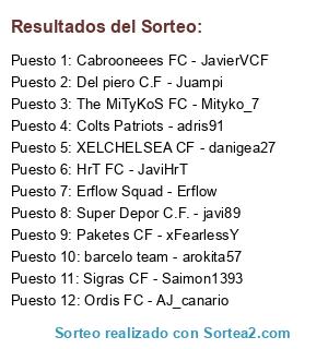 Lista de participantes: Paketes CF - xFearlessY, AD Juventud - rcm15, X - Thee.kiidd, Cifuentes - kolorin, Medellin - carloxdim1, HrT FC - JaviHrT, Sigras CF - Saimon1393, Ilicito utd - Er_FiLLO, barcelo team - arokita57, Bombis - Wolverine_rms, Colts Patriots - adris91, Ordis FC - AJ_canario, Montefrio F.c - Julio, Del piero C.F - Juampi, Mou T3am - serjy, Erflow Squad - Erflow, Cabrooneees FC - JavierVCF, The MiTyKoS FC - Mityko_7, Super Depor C.F. - javi89, XELCHELSEA CF - danigea27.