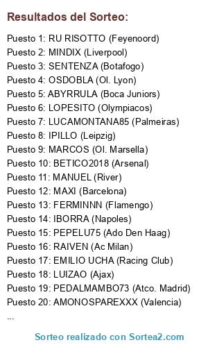 Lista de participantes: SULLENDONKEY (Schalke), OZORA (Benfica), FERMINNN (Flamengo), EMILIO UCHA (Racing Club), LUCAMONTANA85 (Palmeiras), McGREGOR (Sparta de Rotterdam), MARCOS (Ol. Marsella), R. CUERVO (S. Lorenzo), MINDIX (Liverpool), MANUEL (River), SENTENZA (Botafogo), BETICO2018 (Arsenal), KALIMONCHO (Roma), CAPELINHO (B. Dortmund), OSDOBLA (Ol. Lyon), OSCARZAWA (Shaktar Donetsk), MAXI (Barcelona), AMONOSPAREXXX (Valencia), PADRONE (Zenit), RAIVEN (Ac Milan), ECKAE (S. Ettiene), ABYRRULA (Boca Juniors), PICAPISTONES (Santos), IPILLO (Leipzig), IBORRA (Napoles), LOPESITO (Olympiacos), SEGO (Monaco), PEDALMAMBO73 (Atco. Madrid), RU RISOTTO (Feyenoord), PEPELU75 (Ado Den Haag), CEXAR1 (Psg), LUIZAO (Ajax).