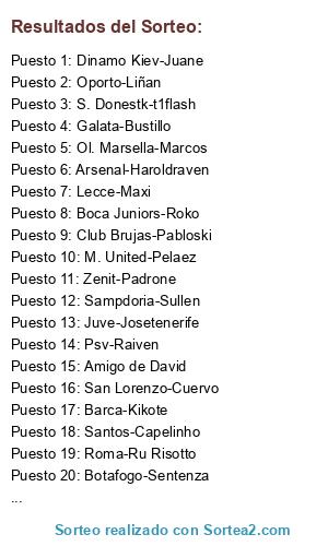 Lista de participantes: Ajax-Luizao, Arsenal-Haroldraven, Boca Juniors-Roko, Botafogo-Sentenza, Club Brujas-Pabloski, Coquimbo-Adrisb, Dinamo Kiev-Juane, Barca-Kikote, Flamengo-Carlitros, Fortaleza-Cesarito, Galata-Bustillo, Amigo de David, Juve-Josetenerife, Lazio-Nugetown, Lecce-Maxi, M. United-Pelaez, Mechelen-Oskarkawa, Monaco-Sego, Montpellier-Betico, Napoli-Angel, Ol. Lyon-Osdobla, Ol. Marsella-Marcos, Psg-Bydavid, Oporto-Liñan, Psv-Raiven, River Plate-Iborra, Roma-Ru Risotto, Sampdoria-Sullen, San Lorenzo-Cuervo, Santos-Capelinho, S. Donestk-t1flash, Zenit-Padrone.