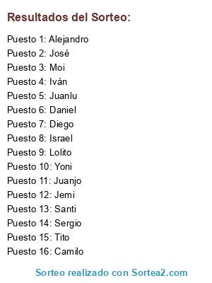 Lista de participantes: Alejandro, Camilo, Daniel, Diego, Israel, Iván, Jemi, José, Juanjo, Juanlu, Lolito, Moi, Santi, Sergio, Tito, Yoni.