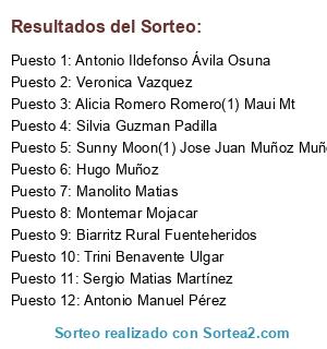 Lista de participantes: Silvia Guzman Padilla, Sergio Matias Martínez, Hugo Muñoz, Veronica Vazquez, Sunny Moon(1) Jose Juan Muñoz Muñoz, Biarritz Rural Fuenteheridos, Trini Benavente Ulgar, Manolito Matias, Antonio Ildefonso Ávila Osuna, Antonio Manuel Pérez, Alicia Romero Romero(1) Maui Mt, Montemar Mojacar.