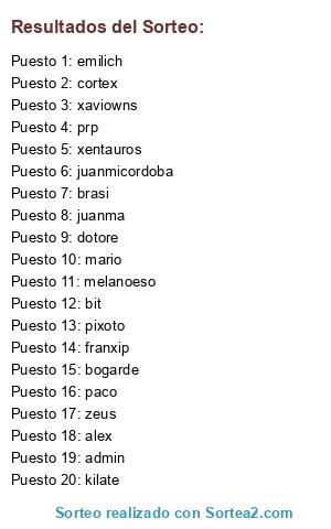Lista de participantes: Davidyinyer, romapro, juanmiole, spawntfe, cortex_xx, MacLovin86, capitanflipi, Rafuka_666, poder__negrito, kratos28, kinglosada, majeitor, Colmenero85, ismaelking90, naxo1994martinez, LiDeR2012, isaakcinho, huied, Juanma, user1, user2, user3.
