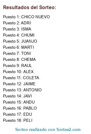 Lista de participantes: TONI, ALEX, JAIME, CHUMI, EDU, PABLO, RAUL, PELI, ADRI, CHEMA, COLETA, ANTONIO, JAVI, ANDU, JUANJO, MARTI, CHICO NUEVO, ISMA.