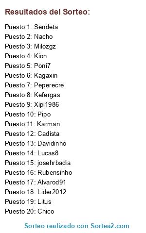 Lista de participantes: Kion, Litus, Sendeta, Chico, Kagaxin, Rubensinho, Milozgz, Xipi1986, Davidinho, Cadista, Karman, Lider2012, Kefergas, Alvarod91, Poni7, Nacho, Lucas8, Peperecre, Pipo, josehrbadia.