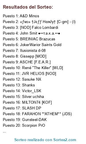 Lista de participantes: A&D Minos, JokerWarior Saints Gold, Victor_LSK, Gunsteel-DAK, BREINIAC Brazucas, -Pr0- Betikadd, FARAHON **ATHEM** (JDS), adm senju, John Smit ●••т.a.ĸ.a.••●, René "The Killer" [WLD], jual001 [NX], Silver uchiha, «ƒмנ» †Jєƒƒ Hαя∂у† [C-gm] - (I), Sasuke NX, SLASH DP, JVR HELIOS [NOD], Shanks, Scorpion PrO, ASCHE [F.E.A.R.], Gissepp [MOD] , MILTON74 [KOF], [NOD] Falco Lombardi, Ilusionista d-08, .