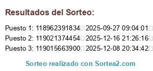 Este sorteo ha sido certificado por Sortea2. Sortea2 garantiza que: