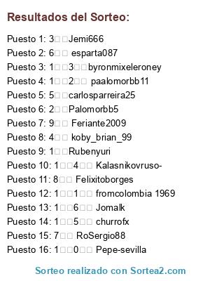 Lista de participantes: 1️⃣Rubenyuri, 2️⃣Palomorbb5, 3️⃣Jemi666, 4️⃣ koby_brian_99, 5️⃣carlosparreira25, 6️⃣ esparta087, 7️⃣ RoSergio88, 8️⃣ Felixitoborges, 9️⃣ Feriante2009, 1️⃣0️⃣ Pepe-sevilla, 1️⃣1️⃣ fromcolombia 1969, 1️⃣2️⃣ paalomorbb11, 1️⃣3️⃣byronmixeleroney, 1️⃣4️⃣ Kalasnikovruso-, 1️⃣5️⃣ churrofx, 1️⃣6️⃣ Jomalk.