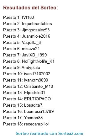 Lista de participantes: rexecampillo1, Leomessi13799, JaviXD_1999, Juanmiole2016, Inquebrantables, Jjmgonzalez93, ivan17102002, NoFightNolife_K1, Yoooop88, IVI180, Losadita7, misava21, ERLTIOPACO, Ivancrm9090, Cristianito_M10, Elpedrito31, Andyplata, Vaquilla_8.
