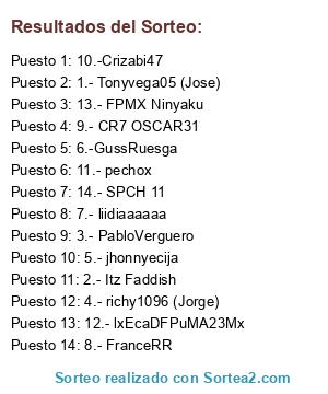 Lista de participantes: 1.- Tonyvega05 (Jose), 2.- Itz Faddish, 3.- PabloVerguero, 4.- richy1096 (Jorge), 5.- jhonnyecija, 6.-GussRuesga, 7.- liidiaaaaaa, 8.- FranceRR, 9.- CR7 OSCAR31, 10.-Crizabi47, 11.- pechox, 12.- lxEcaDFPuMA23Mx, 13.- FPMX Ninyaku, 14.- SPCH 11.