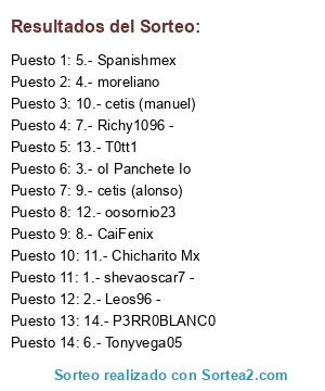 Lista de participantes: 1.- shevaoscar7 -, 2.- Leos96 -, 3.- oI Panchete Io, 4.- moreliano, 5.- Spanishmex, 6.- Tonyvega05, 7.- Richy1096 -, 8.- CaiFenix, 9.- cetis (alonso), 10.- cetis (manuel), 11.- Chicharito Mx, 12.- oosornio23, 13.- T0tt1, 14.- P3RR0BLANC0.