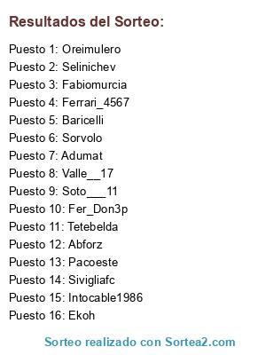Lista de participantes: Soto___11, Fabiomurcia, Ferrari_4567, Oreimulero, Fer_Don3p, Pacoeste, Selinichev, Baricelli, Tetebelda, Intocable1986, Adumat, Sorvolo, Abforz, Valle__17, Sivigliafc, Ekoh.