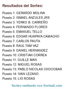 Lista de participantes: EDGAR HUAPAYA CAMACHO, CRISTIAN CORREA, IVAN LEZANO, GUILLE MAN, GERARDO MOLINA, DANIEL HERNANDEZ, MIGUEL ROSAS, RAUL TAM VAZ, CARLOS PAUTA, YERKO B. CARREÑO, FERNANDO FLORES, LIO ROSAS, EMANUEL TELLO, ISMAEL ANZULES JRS, PABLO NICOLAS CHOCOBAR.