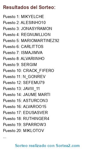 Lista de participantes: ETNIES_1993, ISMAJIMVA, CARLITTOS, RUTHINGER4, JONASYRAMON, SERGIM, N_GONREV, RRUBIOM1, REGNUMLLION, MIKLOTOV, EDUSASVER, SPECIIX, ATON1992, ALVAROO15, ALESINHO10, SPARROW3, JOSIKOLP, SEFEMU79, ASTURCON3, JAVIII_11, ARKHAN99, ALVARIINHO, CRACK_FIFERO, MARIOMARTINEZ92, MIKYELCHE, JAUME MARTI.