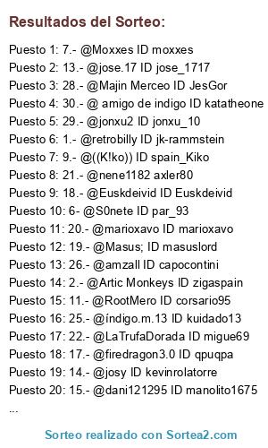 Lista de participantes: 1.- @retrobilly ID jk-rammstein, 2.- @Artic Monkeys ID zigaspain, 3.- @todani ID todani, 4.- @Tiduspain ID Tiduspain10, 5.- @Adrianhruiz ID Adrianhruiz2, 6- @S0nete ID par_93, 7.- @Moxxes ID moxxes, 8.- @Big Tato ID conces94, 9.- @((K!ko)) ID spain_Kiko, 10.- @arkikoki ID arkikoki, 11.- @RootMero ID corsario95, 12.- @Charlie Hunnam ID iglerutts, 13.- @jose.17 ID jose_1717, 14.- @josy ID kevinrolatorre, 15.- @dani121295 ID manolito1675, 16.- @Carloswg ID psiwal, 17.- @firedragon3.0 ID qpuqpa, 18.- @Euskdeivid ID Euskdeivid, 19.- @Masus; ID masuslord, 20.- @marioxavo ID marioxavo, 21.- @nene1182 axler80, 22.- @LaTrufaDorada ID migue69, 23.- @Palote3000 ID Palote3000_FC, 24.- @Draculilla ID Mr_Xaloc, 25.- @índigo.m.13 ID kuidado13, 26.- @amzall ID capocontini, 27.- @RMCF10 ID alberto171 (la L es una i mayúscula), 28.- @Majin Merceo ID JesGor, 29.- @jonxu2 ID jonxu_10, 30.- @ amigo de indigo ID katatheone, 31.- @Sergiodx ID Sergiodepor7, 32.-.